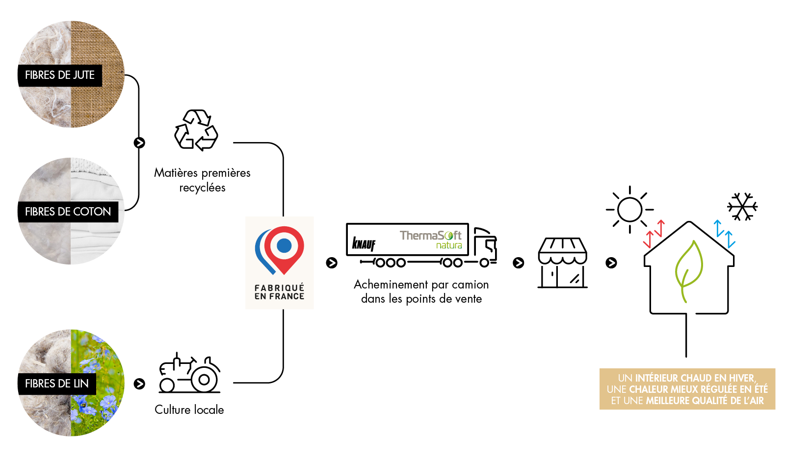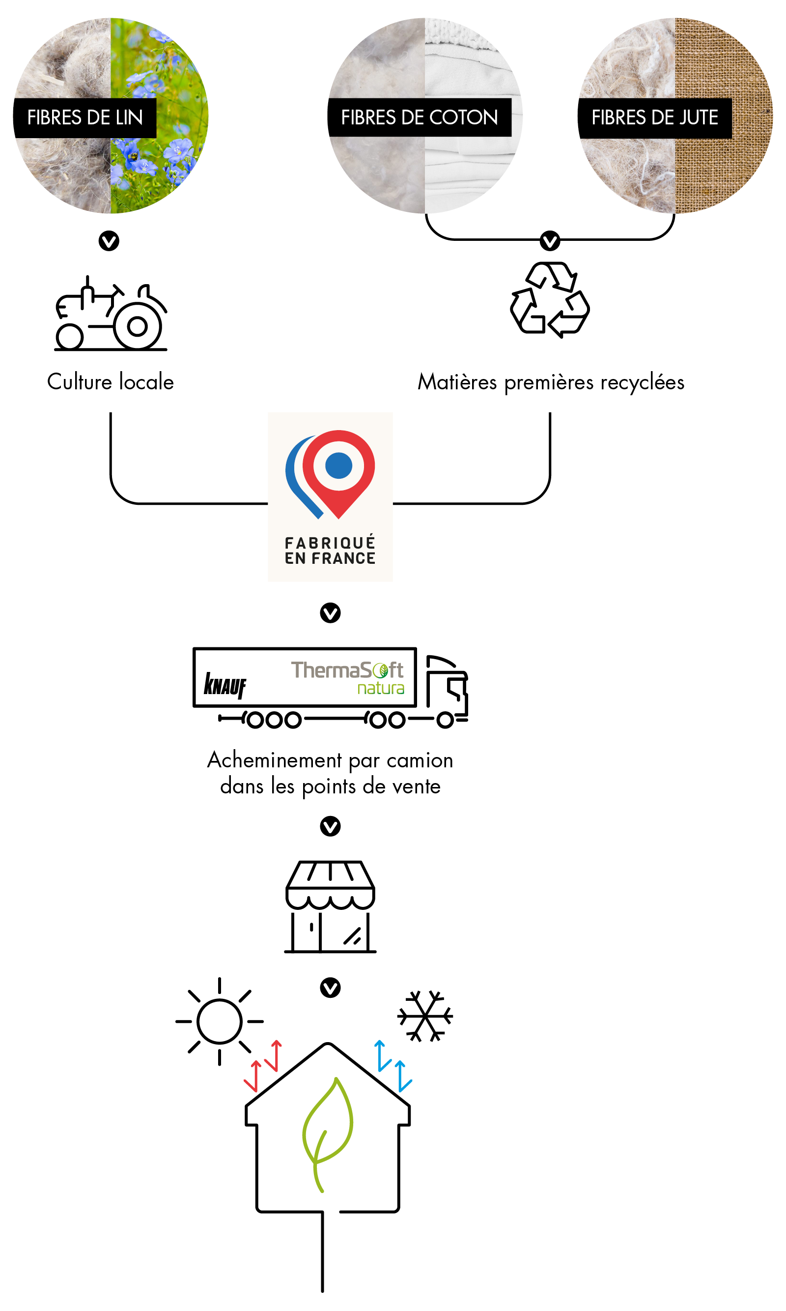 Knauf ThermaSoft® natura est composé de 3 fibres végétales biosourcées : le COTON issu de chute de l'industrie textile, le JUTE issu du recyclage de sacs de denrées alimentaires, et le LIN issu de l’agriculture locale. Cet assemblage lui confère des performances uniques : confort thermique été/hiver, performances acoustiques naturelles et confort de pose remarquable.
